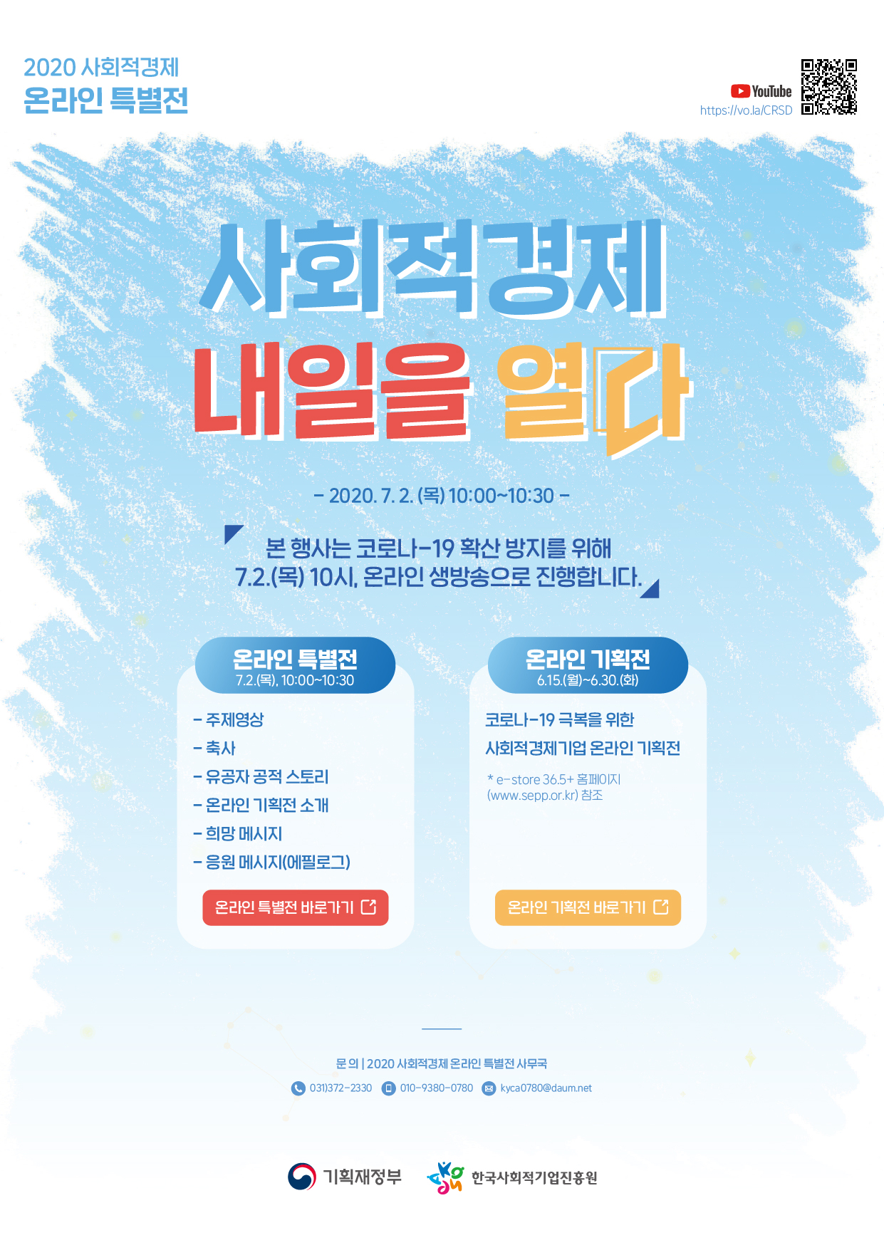 「기획재정부」와 「한국사회적기업진흥원」은 사회적경제계의 코로나-19 위기 극복 및 응원을 위해, 2020 사회적경제 온라인 특별전 "사회적경제, 내일을 열다"를 개최합니다.