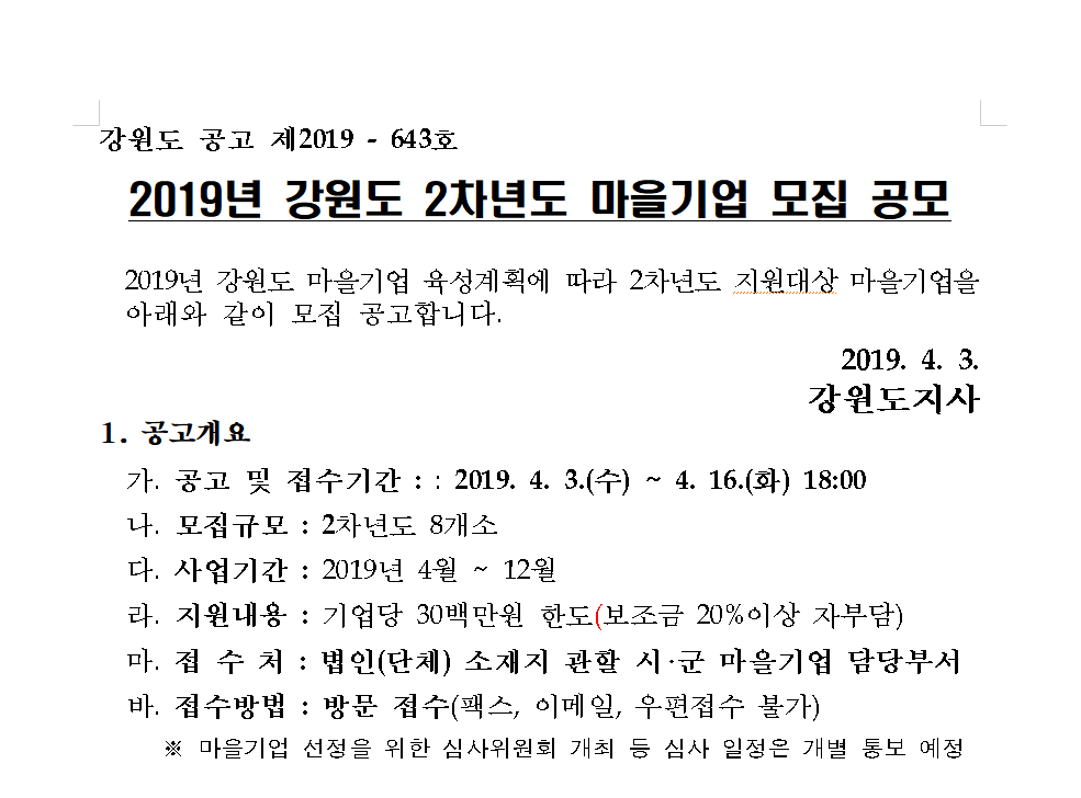 | [공고] 강원도 | 2019년 강원도 3차년도 마을기업 모집 공고 (0) | 2019.04.11 |