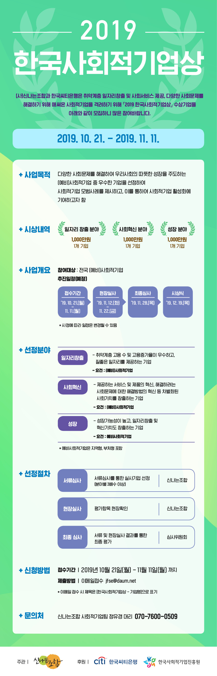 | [공고] 사회적경제활성화전국네트워크 | 2019년 제6회 우수 사회적기업 어워드 모집(~11/15) (0) | 2019.10.21 |